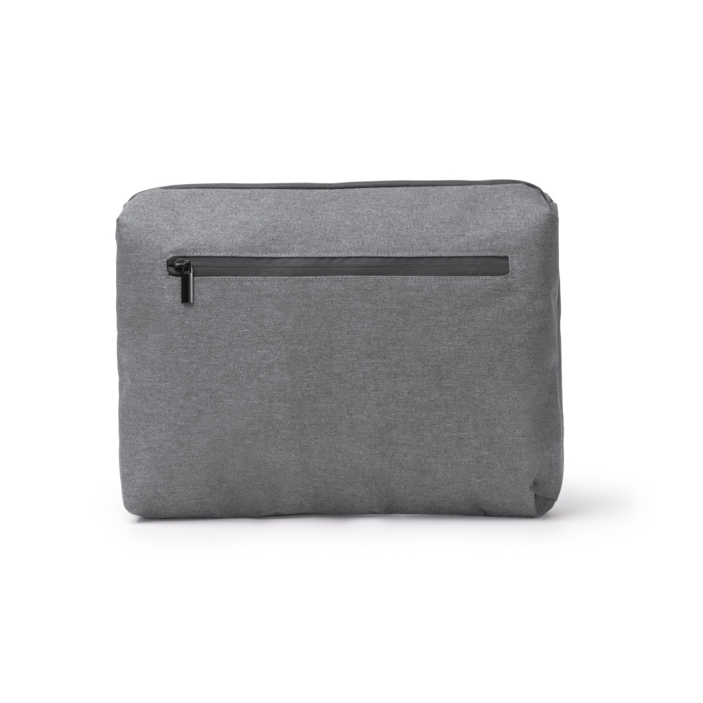 Double briefcase with two internal compartments for laptops with a screen size of up to 12 inches, made of RPET 300D fabric and PVC. The material used to make RITMON and the zippers are waterproof. The briefcase opens fully. It also has other additional medium and small pockets, as well as a mesh compartment with a zipper closure. It has several elastic straps for securing smaller items. RITMON also has a large external pocket with a zipper closure, making it a complete and practical solution.
