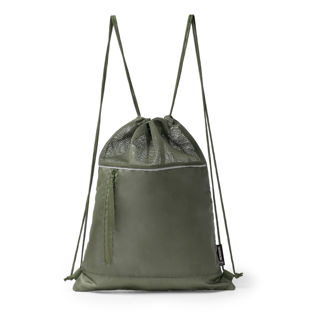 Drawstring bag made of 210D RPET fabric with mesh panels on the top and back. Features a front exterior pocket for carrying smaller items and a reflective strip on the front. The pocket has a zipper in a color that matches the body of the backpack.