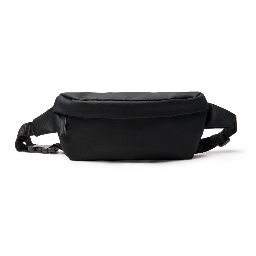 A waist bag made of PU leather and 600D RPET fabric, soft to the touch. It features a main compartment with a zipper closure and a matching drawstring. It also includes an adjustable strap with reinforced sides and a buckle closure for a secure and comfortable fit.