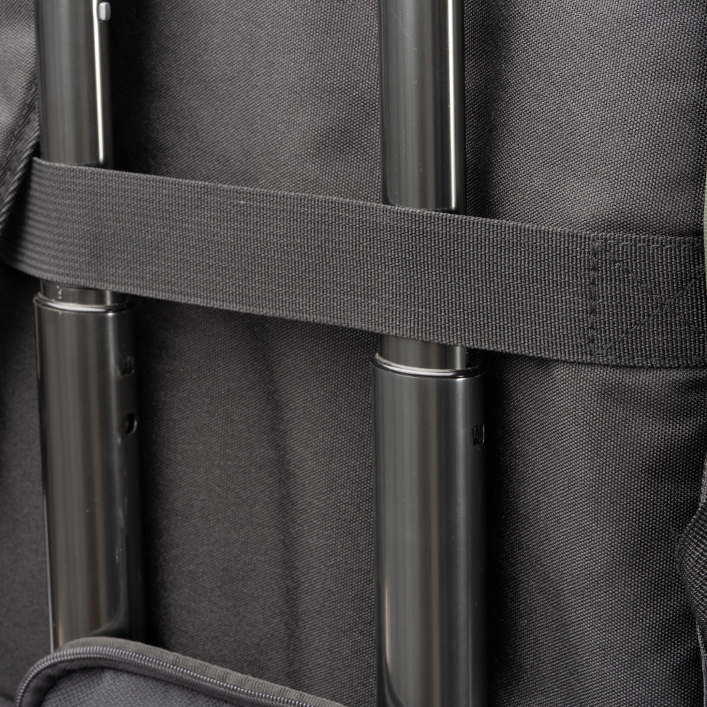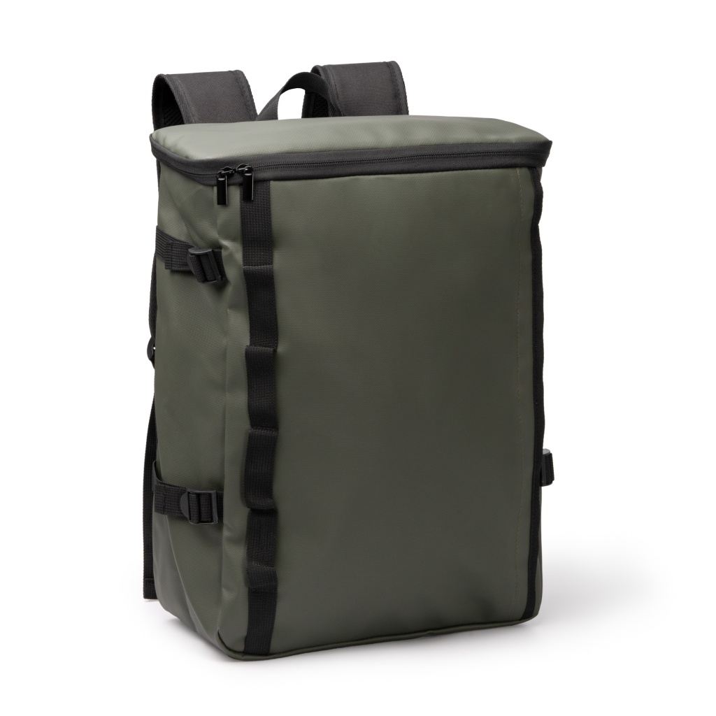 A backpack made of PU leather and 600D polyester, featuring a large main compartment with a padded top, a zipper closure, and an internal pocket with an elastic strap designed to hold a laptop with a screen size of up to 16 inches. There is a hidden external pocket on the front and six attachment points on the side. Adjustable side straps allow you to customize the backpack to its contents, and the carrying strap makes it a versatile and comfortable solution. Padded back and shoulder straps.