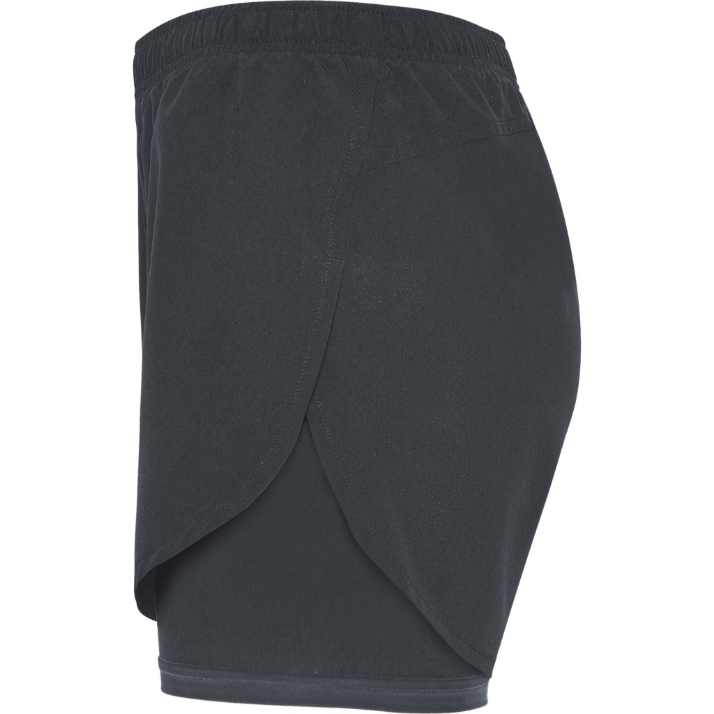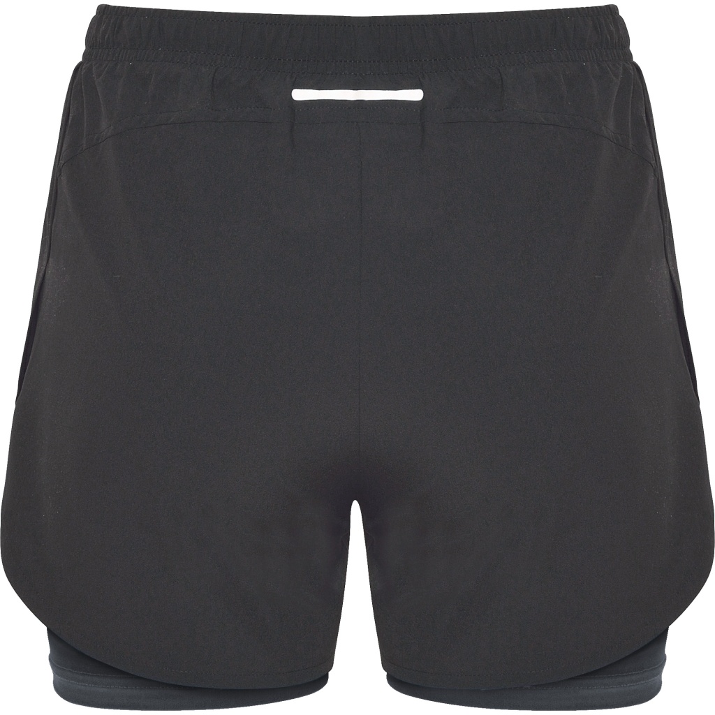 Woman´s sports shorts with contrasting short leggings inside. Elastic waistband with crossed inner drawcord for easy adjustment. Reflective detail. Body fitting and special elastic fabric for running.