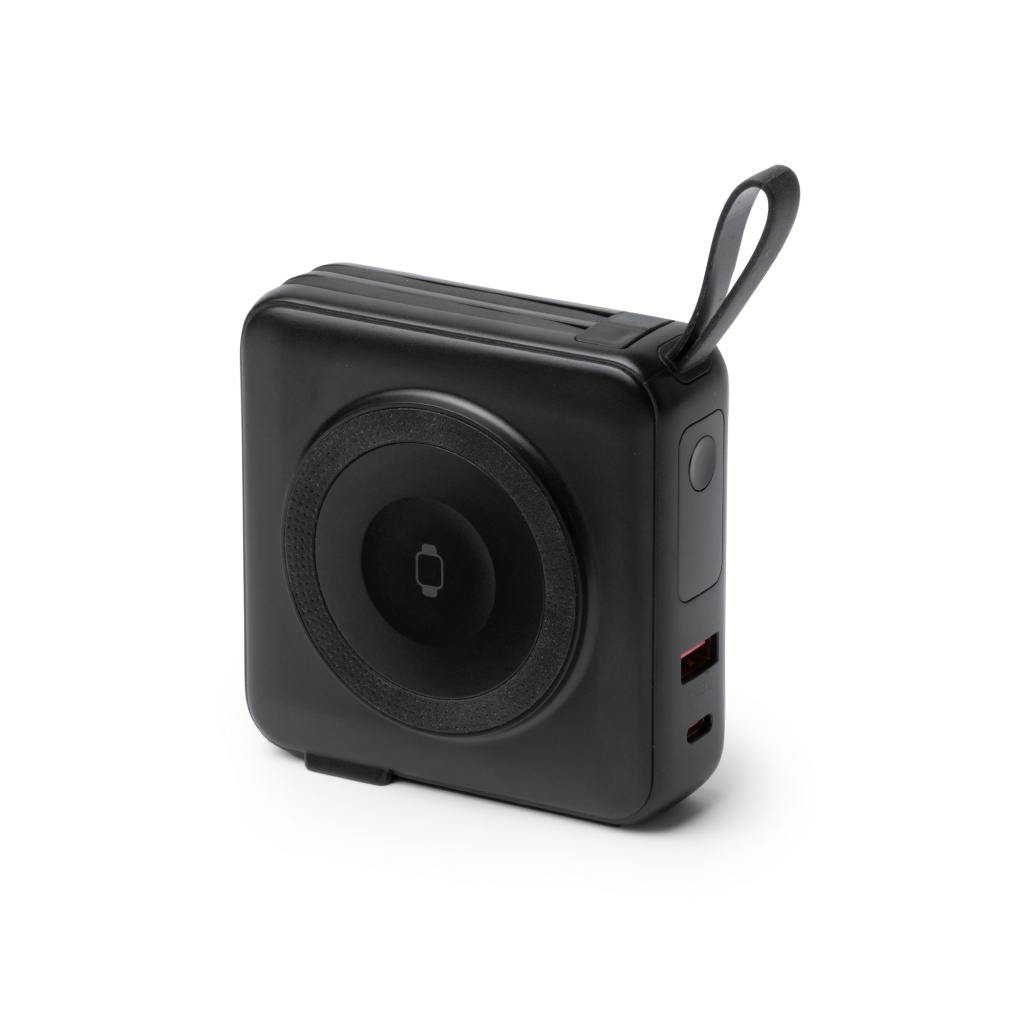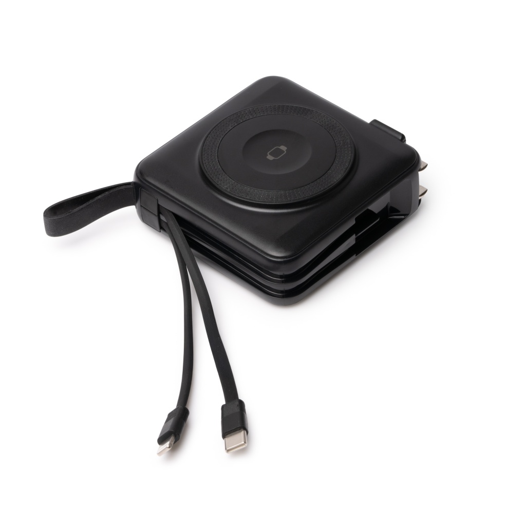 A 3-in-1 portable power bank with a 10,000 mAh capacity and fast charging, delivering 15 W for wireless charging and 20 W for wired charging. It is made of ABS plastic and includes a wireless charging pad for devices compatible with this technology. An integrated USB-C cable and Lightning cable built into the body, as well as a display showing the charge percentage, are included.