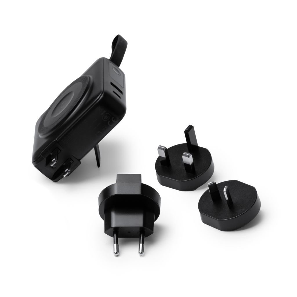 Power adapter suitable for use in Europe, the UK, and Australia.