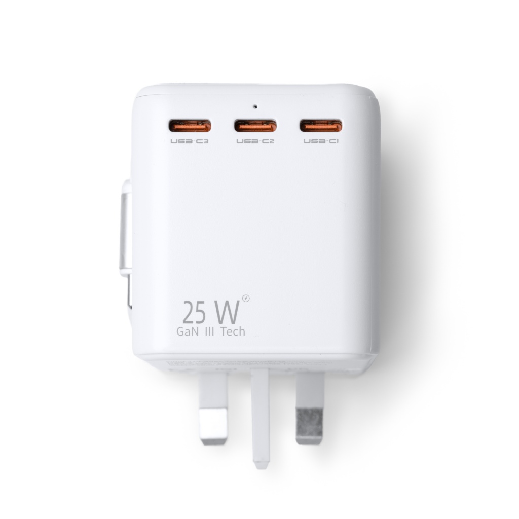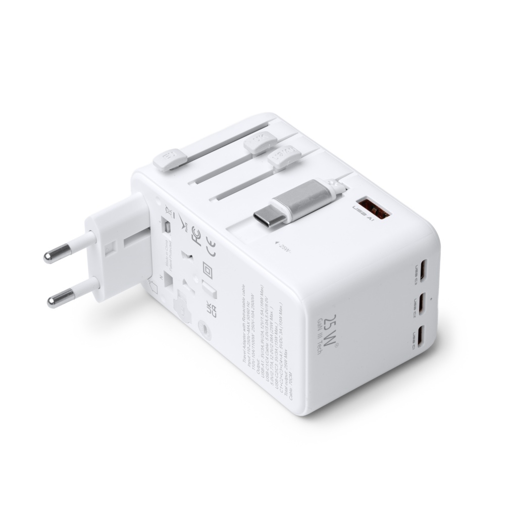 Podróżny adapter wykonany z wysokiej jakości poliwęglanu. Posiada maksymalną moc 25 W do szybkiego ładowania z odpowiednimi kablami, wyjściem USB i trzema wyjściami USB typu C. Odpowiedni do stosowania w Europie, Wielkiej Brytanii, USA, Azji i Australii. Posiada również wysuwany kabel przyłączeniowy USB typu C.