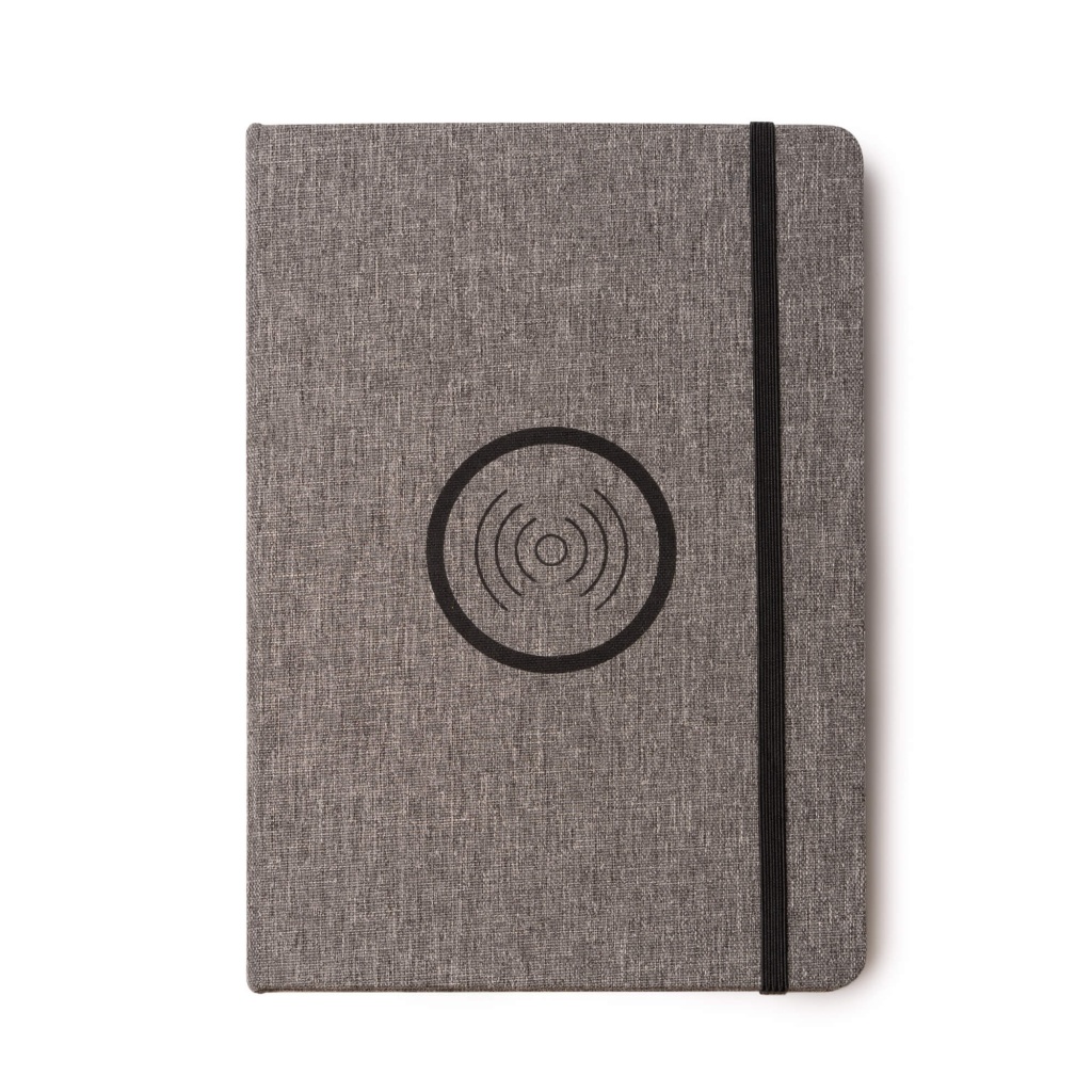 Notatnik A5 wykonany z tkaniny RPET z bezprzewodową powierzchnią ładującą o mocy 15 W. Posiada port USB typu C służący do ładowania i elastycznego zamykania podkładki.