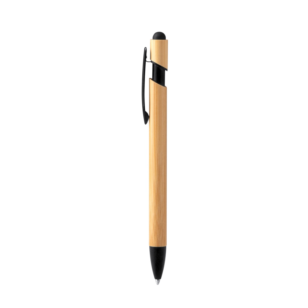 Długopis z korpusem i przyciskiem wykonanymi z bambusa. Kolorowe detale z chromowanym efektem i pasującym wskaźnikiem dotykowym. Wyposażony w duży wkład z niebieskim atramentem, pozwalającym na płynne pisanie i dłuższe użytkowanie.