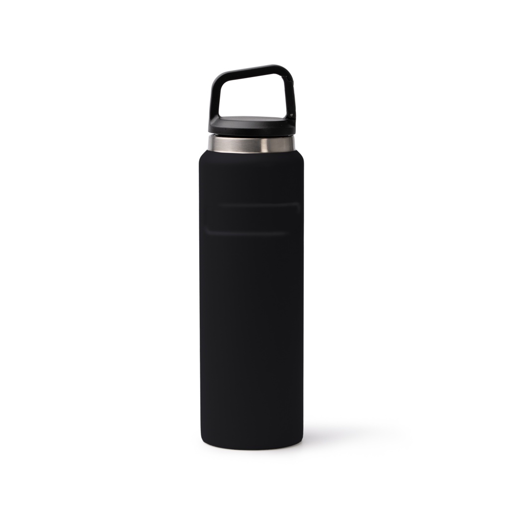 Termos z podwójnymi ściankami o matowym wykończeniu wykonany ze stali nierdzewnej 304 pochodzącej z recyklingu. Pojemność: 550 ml. Czarna zakrętka z wbudowanym karabińczykiem do przenoszenia na uchwycie.