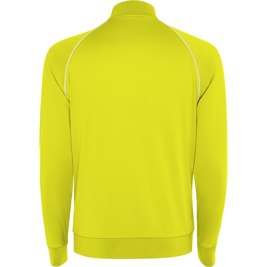 Bluza sportowa z wysokim dekoltem, raglanowymi rękawami i zamkiem błyskawicznym z przodu. Prążkowane obszycie, kołnierz i mankiety 1x1. Miękka taśma kryjąca przeszycie na karku z głównej tkaniny. Tylny dekolt i mankiety wykonane z głównej tkaniny. Odblaskowe lamówki na raglanowych szwach z tyłu i z przodu.