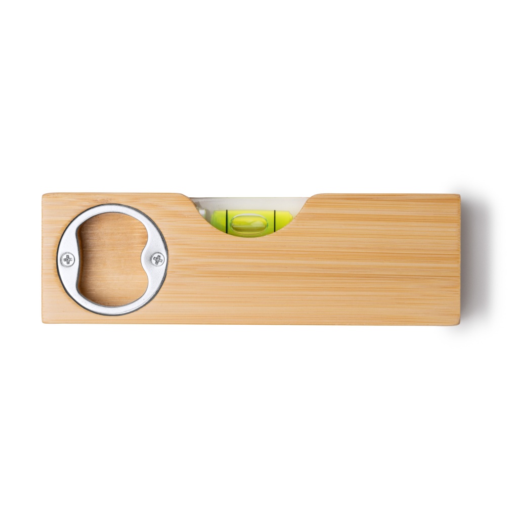 Poziomica wykonana z bambusa z wbudowanym w korpus metalowym otwieraczem do butelek.