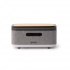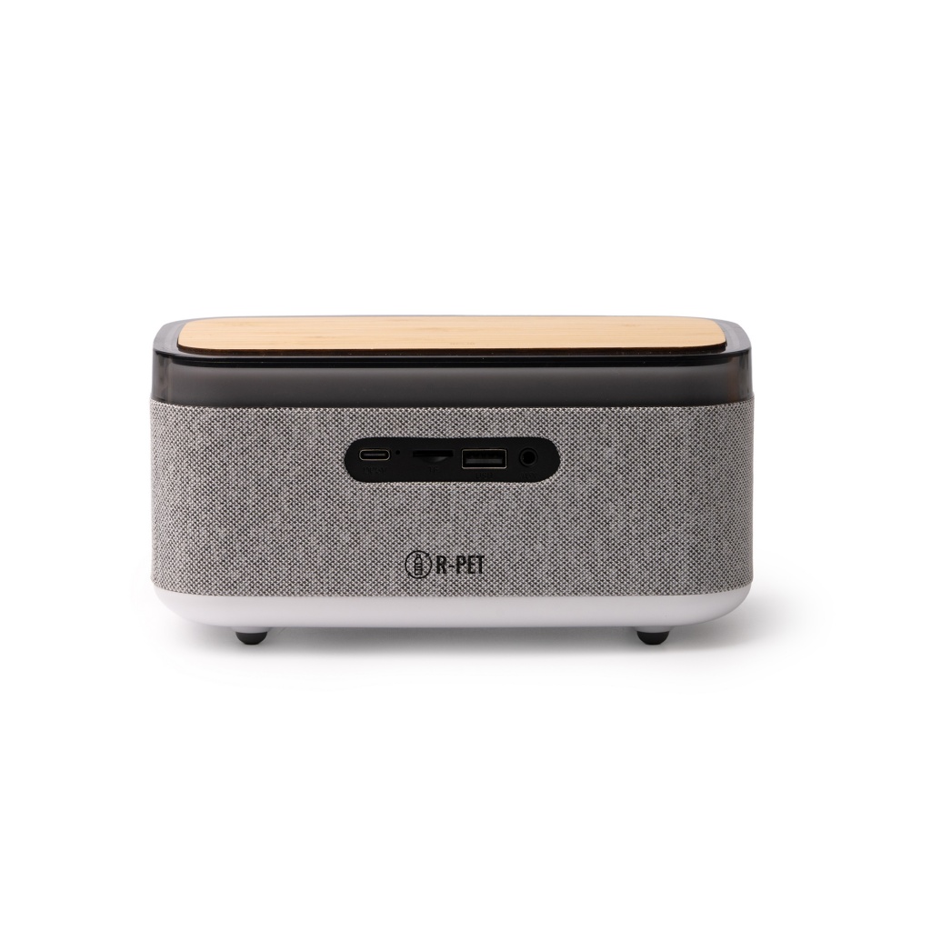 Wireless speaker with a body made of bamboo and recycled RPET fabric. Multiple functions: alarm clock, lamp, and clock, displayed on the front. Offers various lighting modes around its perimeter. 10W wireless charging station for smartphones. Multiple playback modes: Bluetooth connection, relaxation sounds, and FM radio mode. In addition, the device has USB Type-C, USB, auxiliary audio, and memory card inputs.