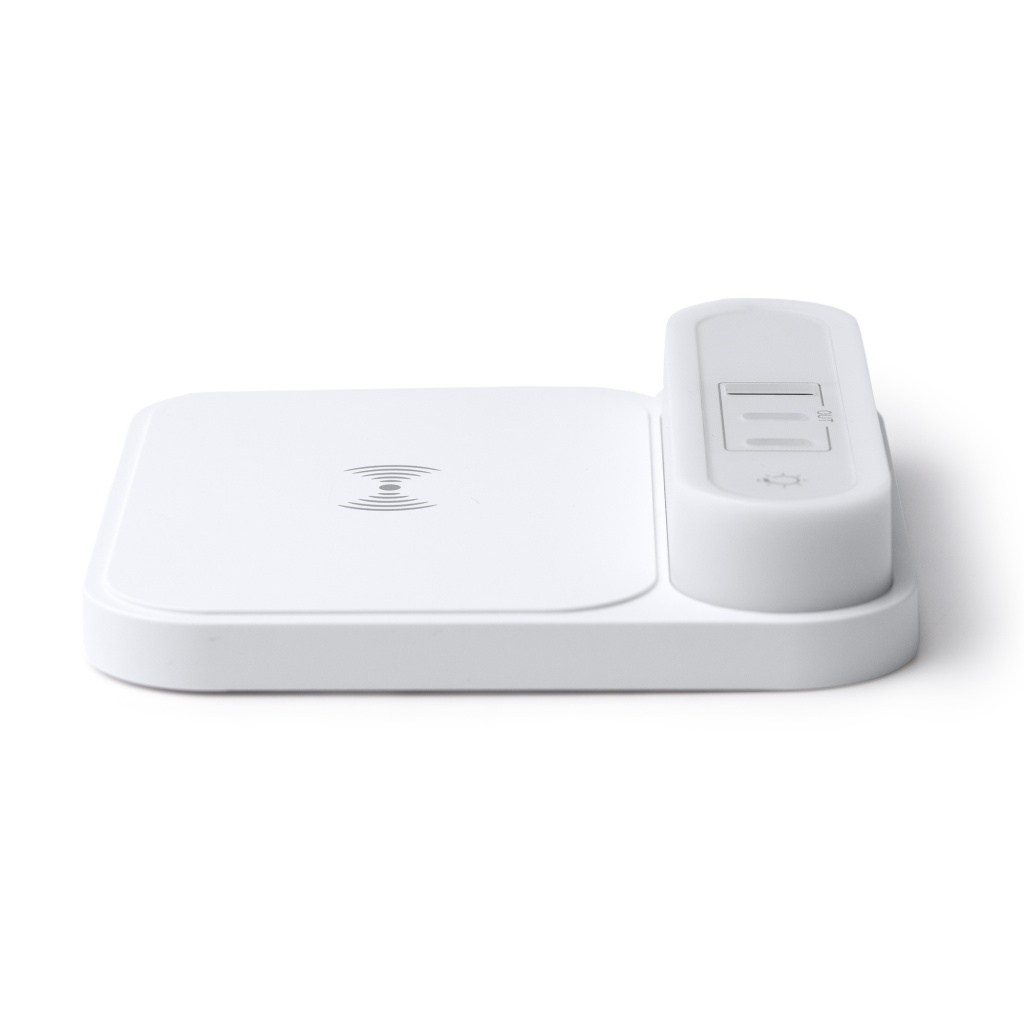 Wireless charging station with built-in lamp. Fast charging: 15 W. Two outputs for charging with a USB Type-C cable and one with a USB cable. The set includes a USB Type-C cable for connecting to the mains.