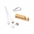 4-in-1 charger cable with USB Type-C and Lightning adapter, USB and USB Type-C input. Features a bamboo accessory with a smartphone holder that also stores and protects the cable ends. Carrying carabiner included.