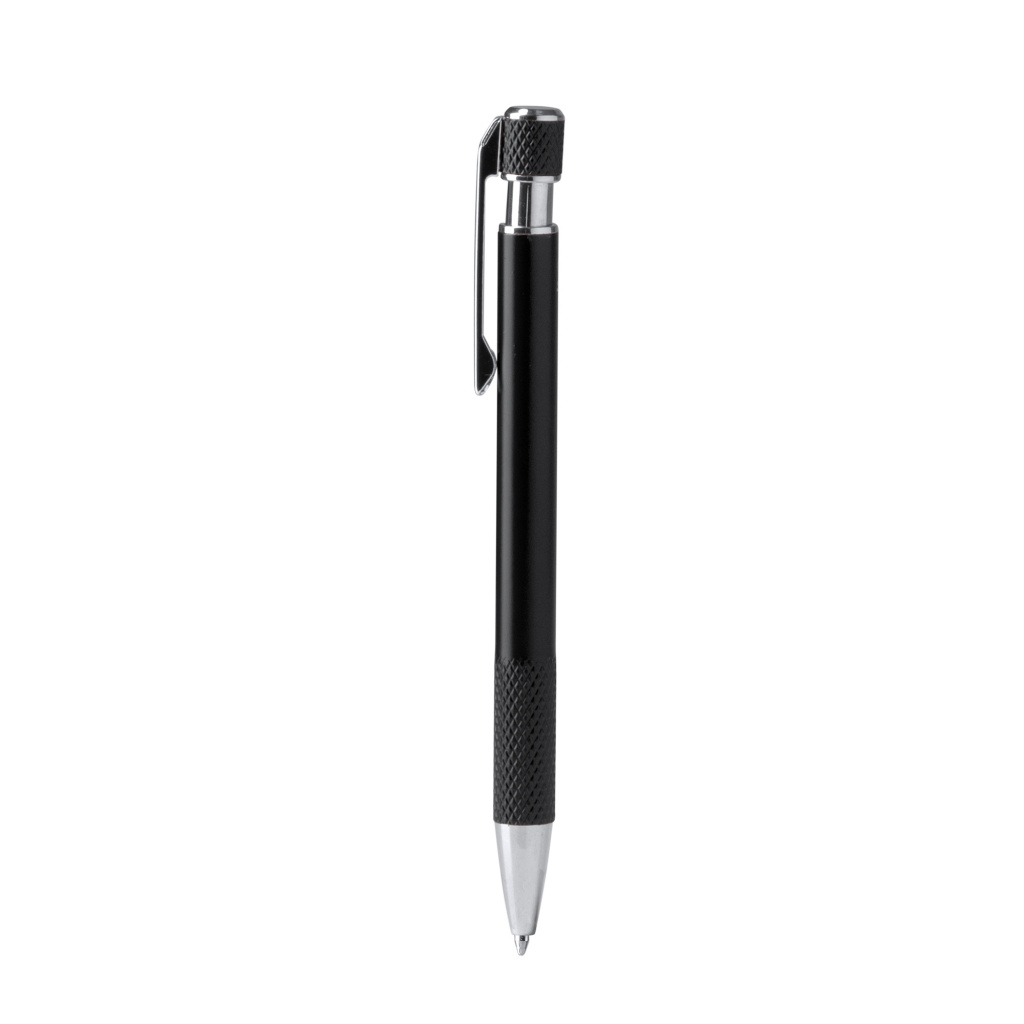Pen made of recycled aluminum, matte finish in a solid color with silver details. Textured in the grip and button area. Blue ink.