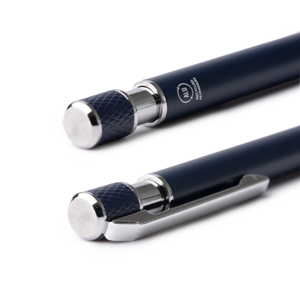 Pen made of recycled aluminum, matte finish in a solid color with silver details. Textured in the grip and button area. Blue ink.