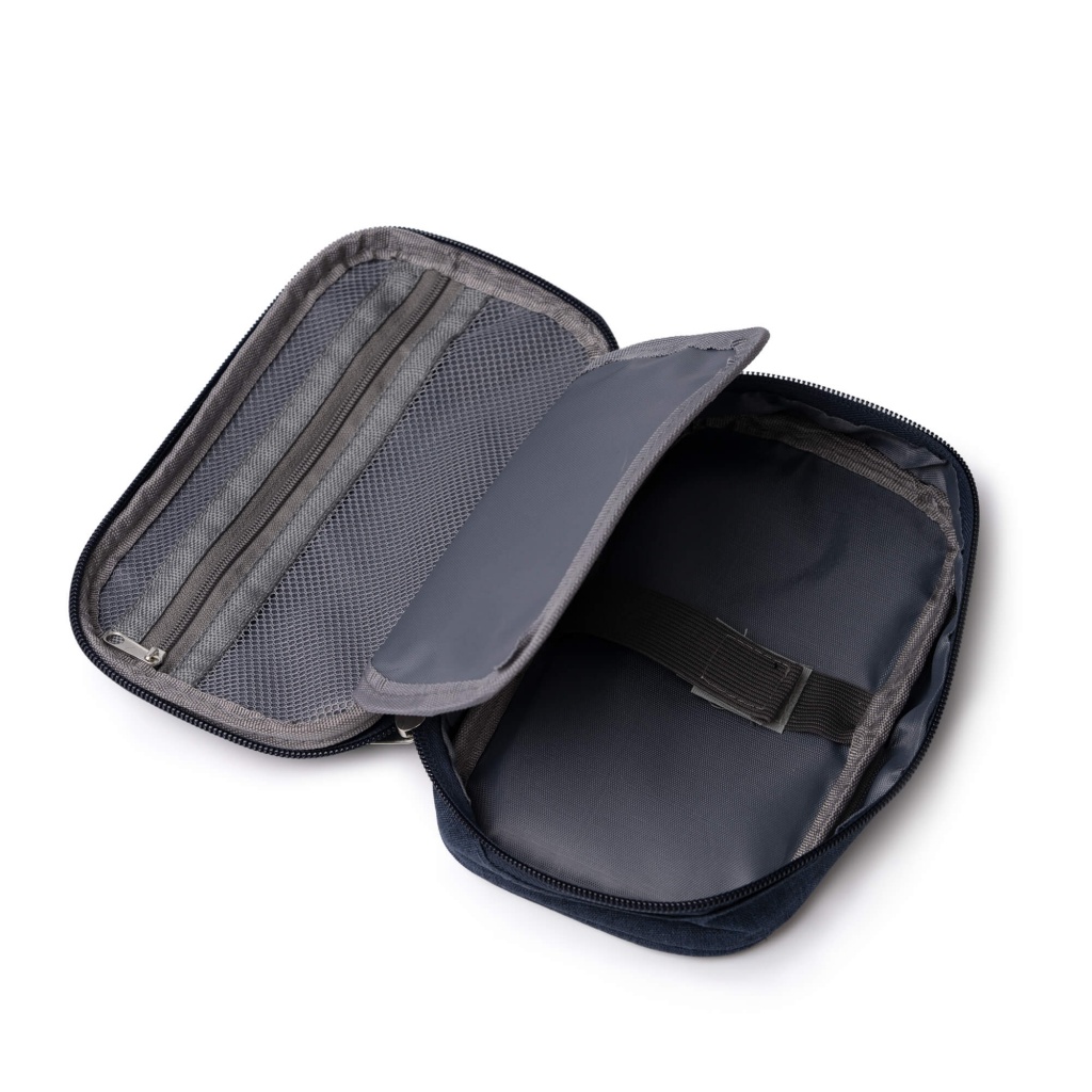 A cover made of RPET fabric, designed specifically for storing and organizing cables. It has a zippered mesh compartment, a main compartment with Velcro closure, and an intermediate compartment for storing small items. A matching carrying strap is included.