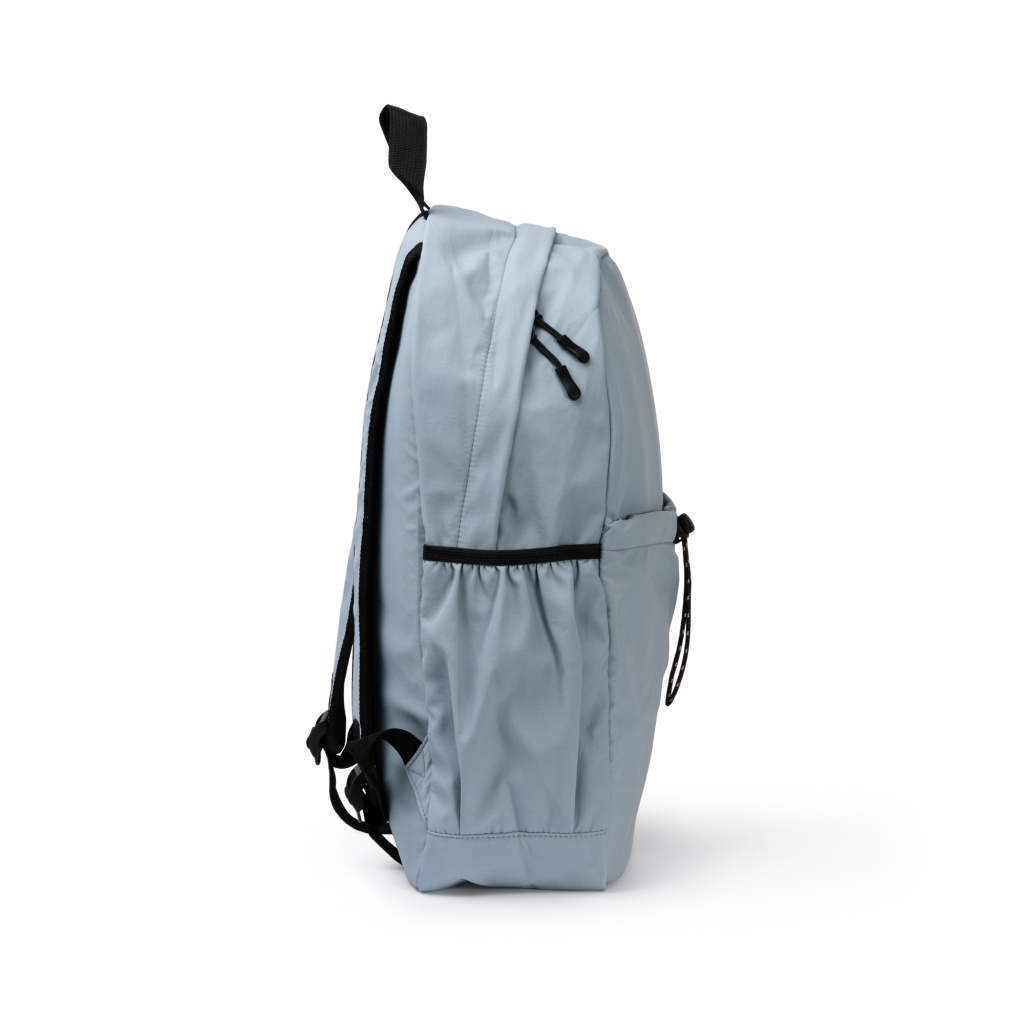 Backpack made of soft nylon. Main compartment with padded pocket for a laptop with a screen size of up to 16 inches and a small zippered pocket. Two side pockets for water bottles with elastic straps for added security.
