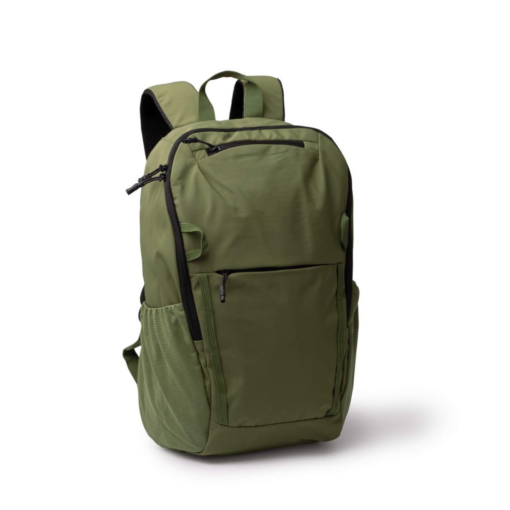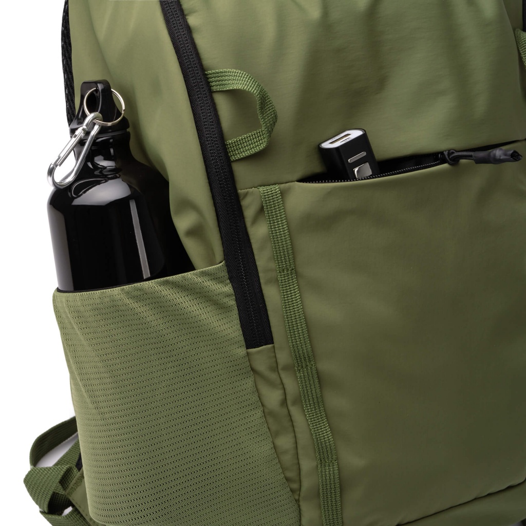 Backpack made of 280D Taslon nylon. It has a main compartment with a double zipper closure. Inside, it has a padded pocket for a laptop with a screen size of up to 15 inches, as well as a smaller zippered pocket. It has two external front pockets with zippers and two side mesh pockets with elastic bands specially designed to hold bottles, along with the body of the backpack. Its shoulder straps and back are padded for greater comfort. It also includes a side strap for a stroller.