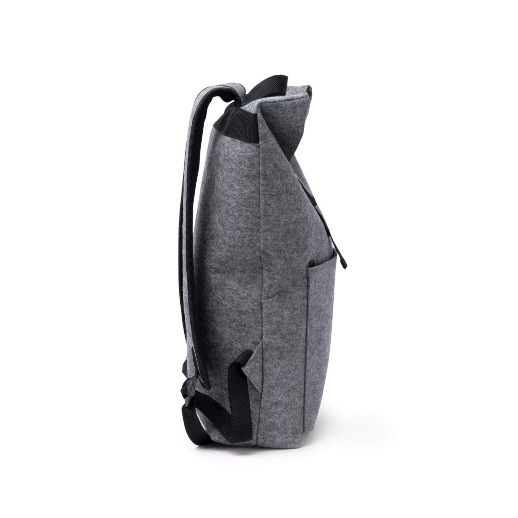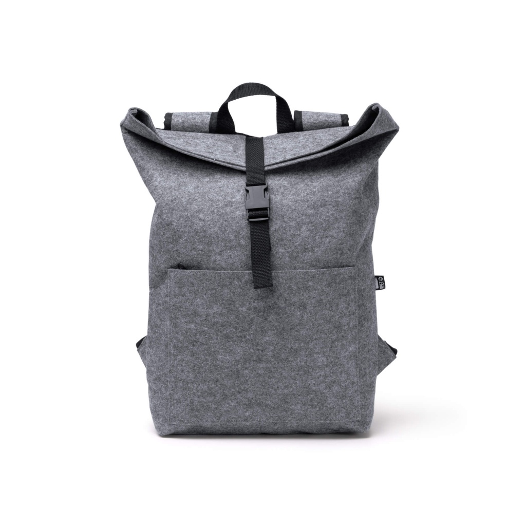 Recycled felt backpack with flap. Fastening to close the main compartment, front pocket for storing small items, and adjustable shoulder straps.