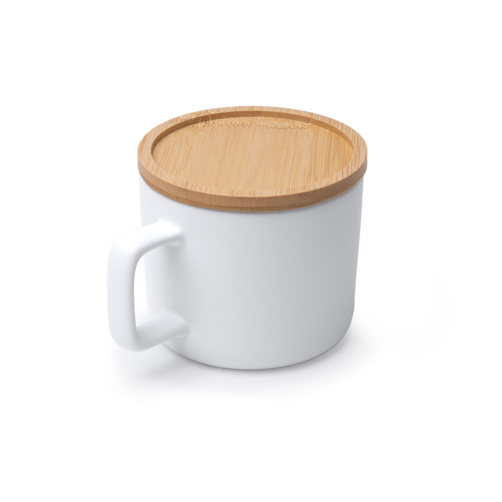 Ceramic mug with a matte finish and square handle. Capacity: 350 ml. Bamboo lid that doubles as a coaster. The interior features a glossy finish for increased strength and durability. Designed specifically for sublimation.