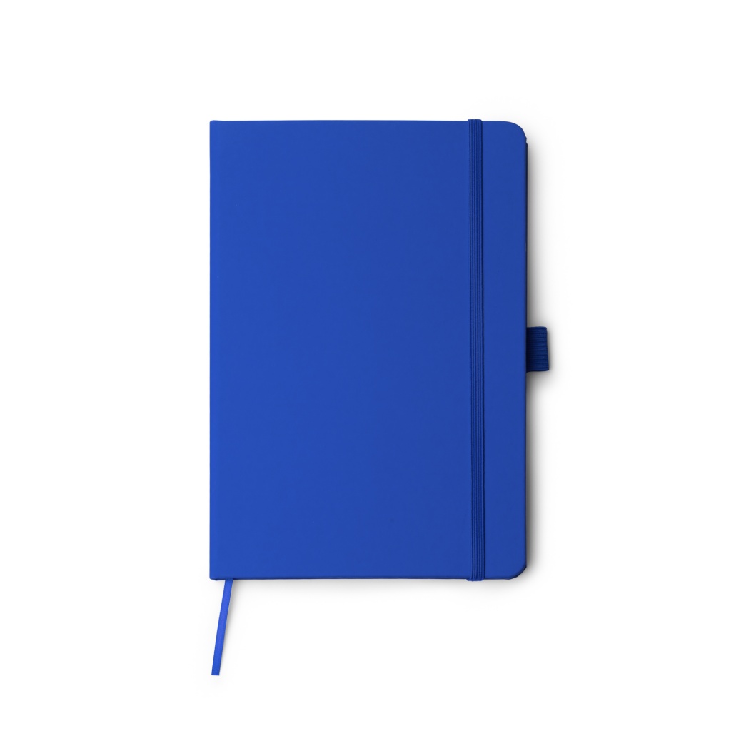 A5 notebook made of recycled PU leather with blank pages and a smartphone and pen holder. Bookmark, elastic closure, and pen holder matching the cover included.