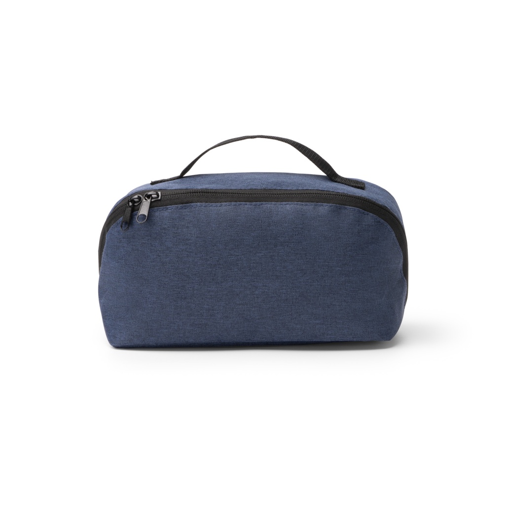 A cosmetic bag made of 600D RPET fabric with a diagonal zipper closure. Its main compartment has a large capacity and opens 180 degrees. It features a separate zippered pocket that acts as a divider, as well as an additional mesh pocket with an elastic drawstring.