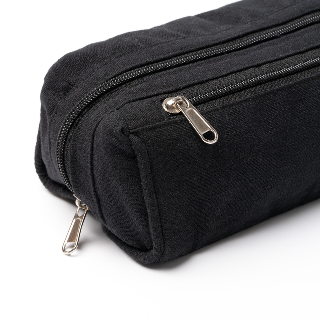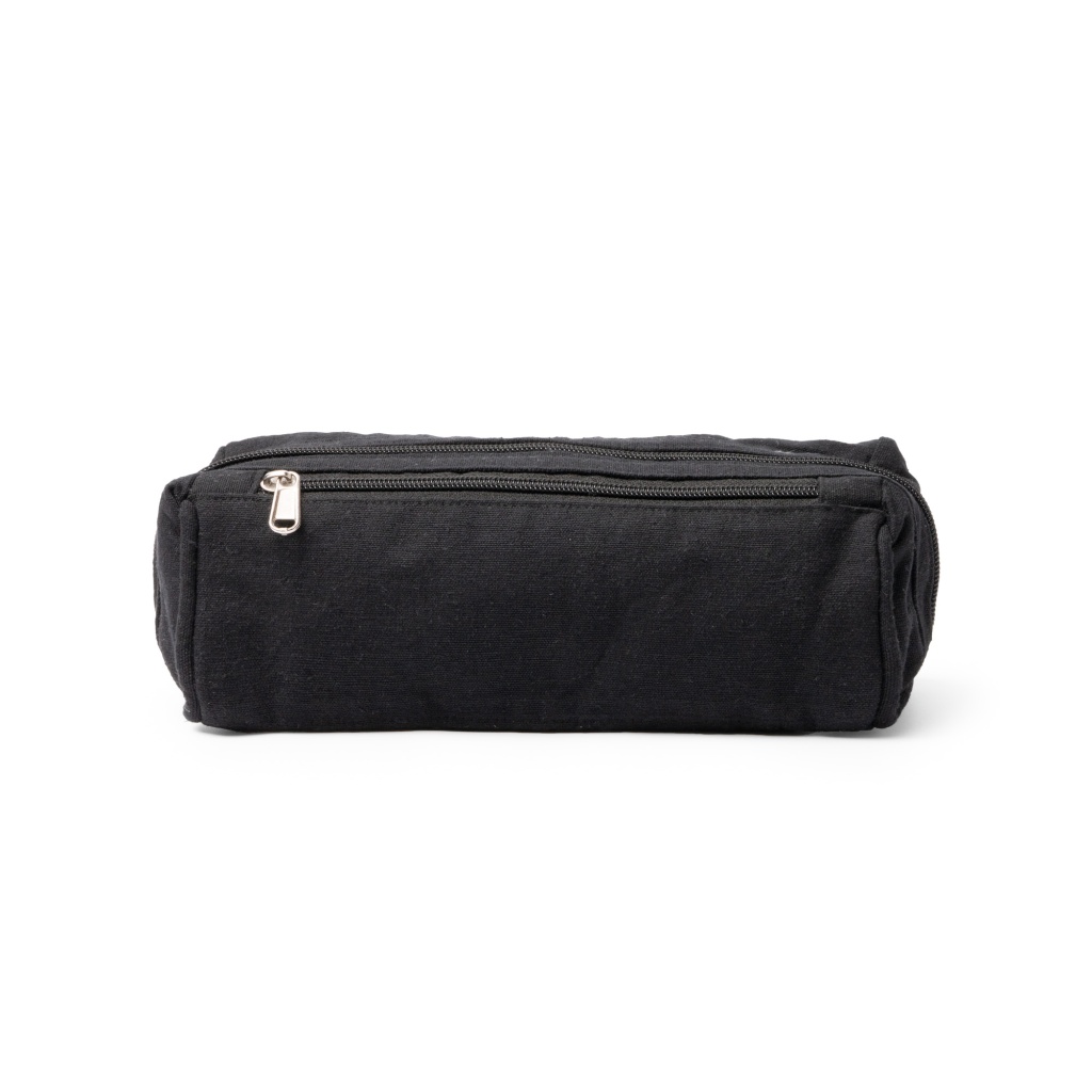 A cosmetic bag made of recycled cotton (weight: 300 g/m²) with a main compartment and an outer pocket for smaller items.