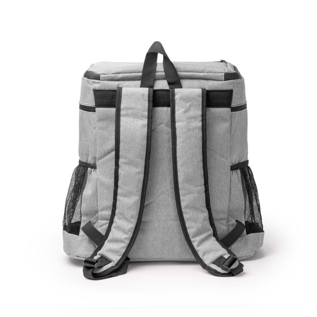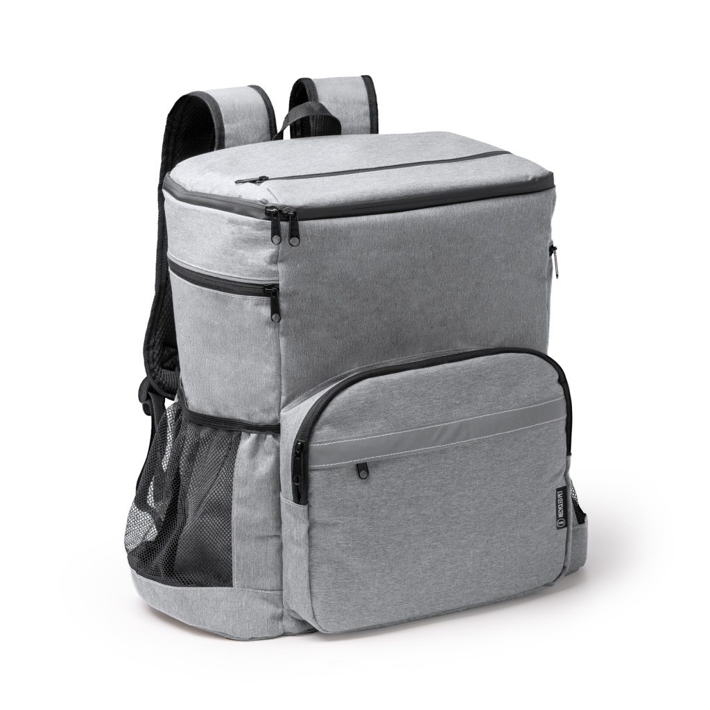 An insulated backpack made of 600D RPET fabric. It features a main compartment and a top pocket, both with insulated interiors that help keep food at the optimal temperature and allow for the storage of smaller snacks.