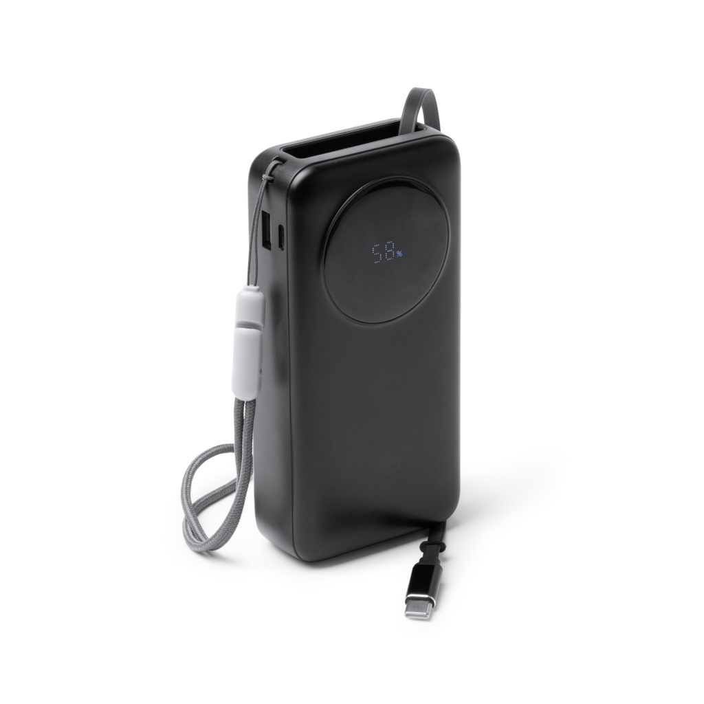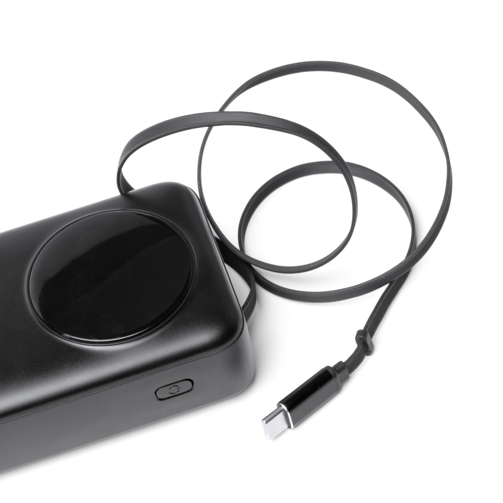 A robust 20,000 mAh power bank made of ABS plastic with a maximum output power of 22.5 W. It features a large LED display showing the battery level as a percentage and an integrated, retractable USB-C output cable in a color that matches the body. USB-C input and output ports, as well as a USB output port. Carrying strap included.