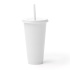 A reusable cup with a lid and straw made from recycled polypropylene. The lid snaps on and has a hole for the straw. The straw is durable and rigid, with a thickened end to prevent it from falling out of the cup. The lid and straw are color-coordinated with the cup body.