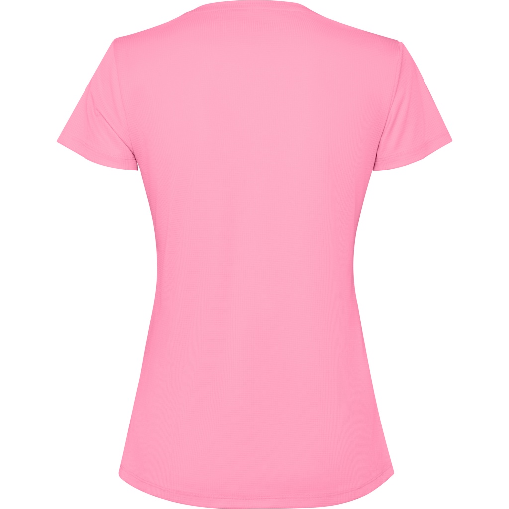 Women's fitted short-sleeved technical T-shirt. Covering of the seams in the collar in the same color. Back of the T-shirt slightly longer than the front. Side seams offset to the front.