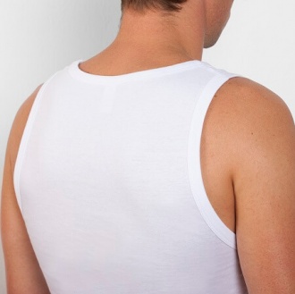 Vest with wide straps, slim fit, ribbed single jersey in neck and armhole. Looped side seams with four thread for greater durability.