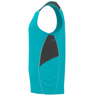 Technical tank top with reflective details. Crew neck with reinforced covered seams. Combined in two polyester fabrics and three colours. Interlock main fabric, side and upper panels in microperforated fabric for greater breathability. Easy dry.