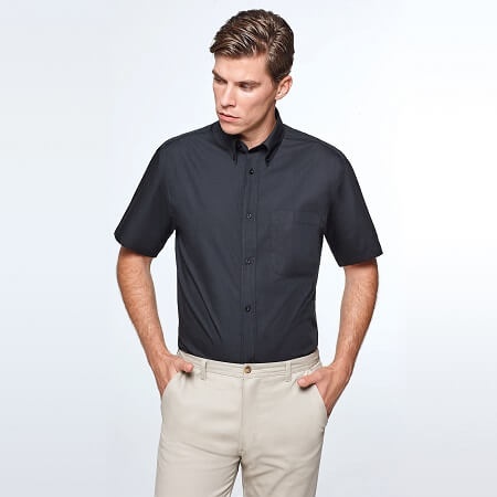 Short sleeve shirt and classical starched collar with 1 button. Left front pocket, flap with 7 matching buttons and curved hem. Easy care.
