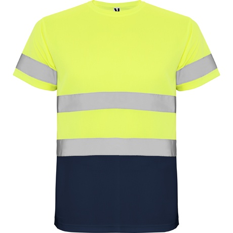High visibility short sleeve technical t-shirt. Crew neck in the same fabric and reinforced covered seams in collar. Two horizontal reflective bands in body and one in sleeves.