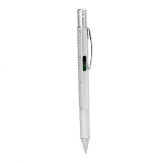 Multifunction ball pen with the following tools: level, ruler in centimeters and inches, flat screwdriver and star screwdriver.