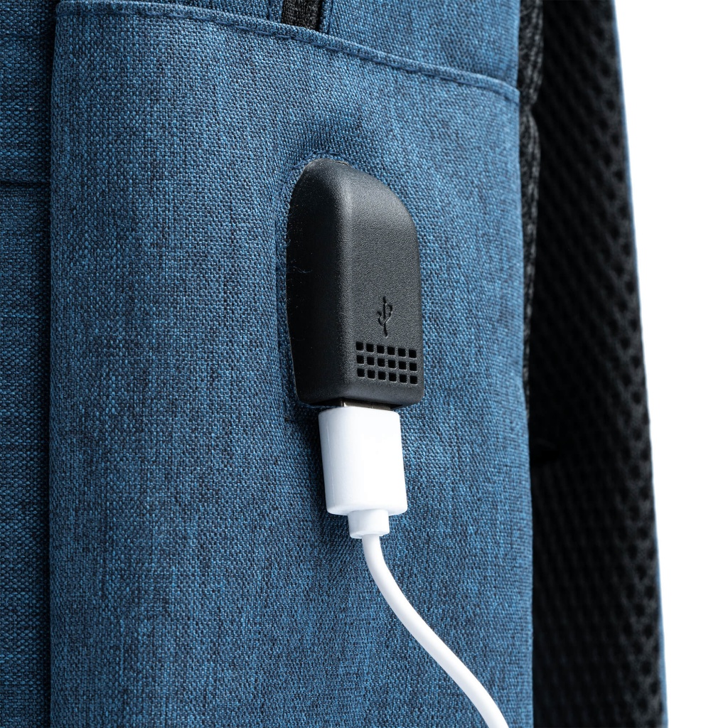 Backpack made of RPET 600D polyester. It has a built-in USB port for connecting your own power banks, front and side pockets, padded back and suspenders.Main compartment also padded, ideal for a laptop or tablet.
