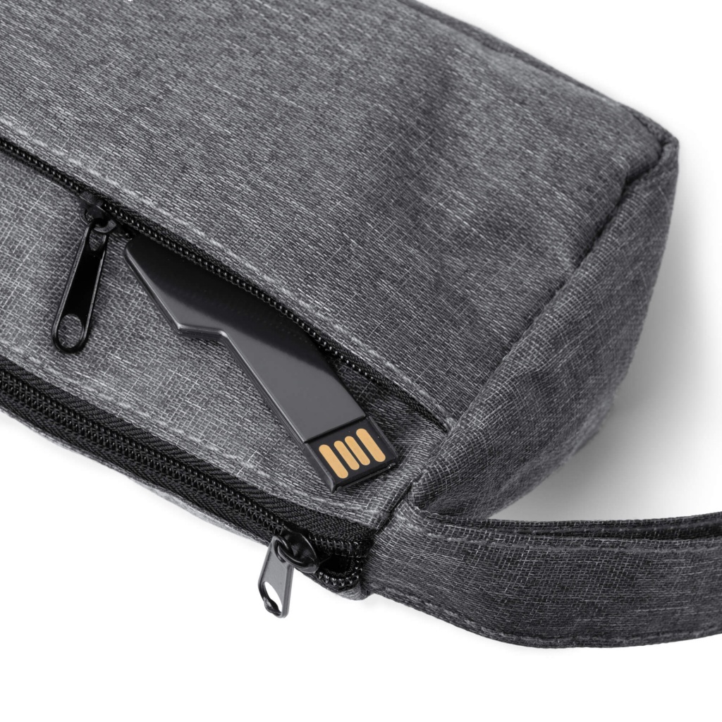 Cosmetic bag made of 300D RPET fabric. Main compartment and outer pocket with zipper closure. Practical carrying handle included.
