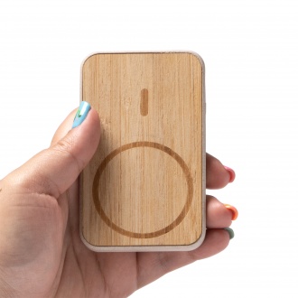 The 5000 mAh powerbank with a body made of bamboo and wheat fibre and a wireless charger with magnetic attachment function is a compact and eco-friendly option for charging devices on the go. With a capacity of 5000 mAh, it provides reliable charging for your smartphone or other devices.