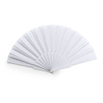 Fan with plastic ribs and polyester fabric. Presented in white box.