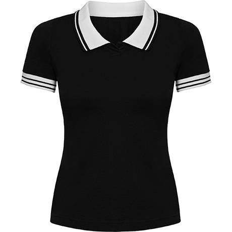 Damska koszulka polo z krótkim rękawem. Dopasowany krój. Bez zapięcia przy kołnierzyku. Mankiety i kołnierzyk z dzianiny. Boczne rozcięcia, dłuższy tył. Szwy boczne.
