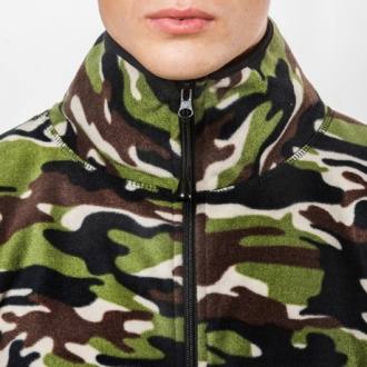 Fleeced jacket for outdoor sports, with high neck and long sleeve ribbed to contrast. Pocket with zip in left sleeve and front zip, both in contrast. Seams in side and chest. Elbow pads in same fabric.