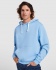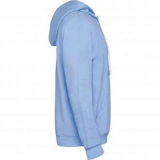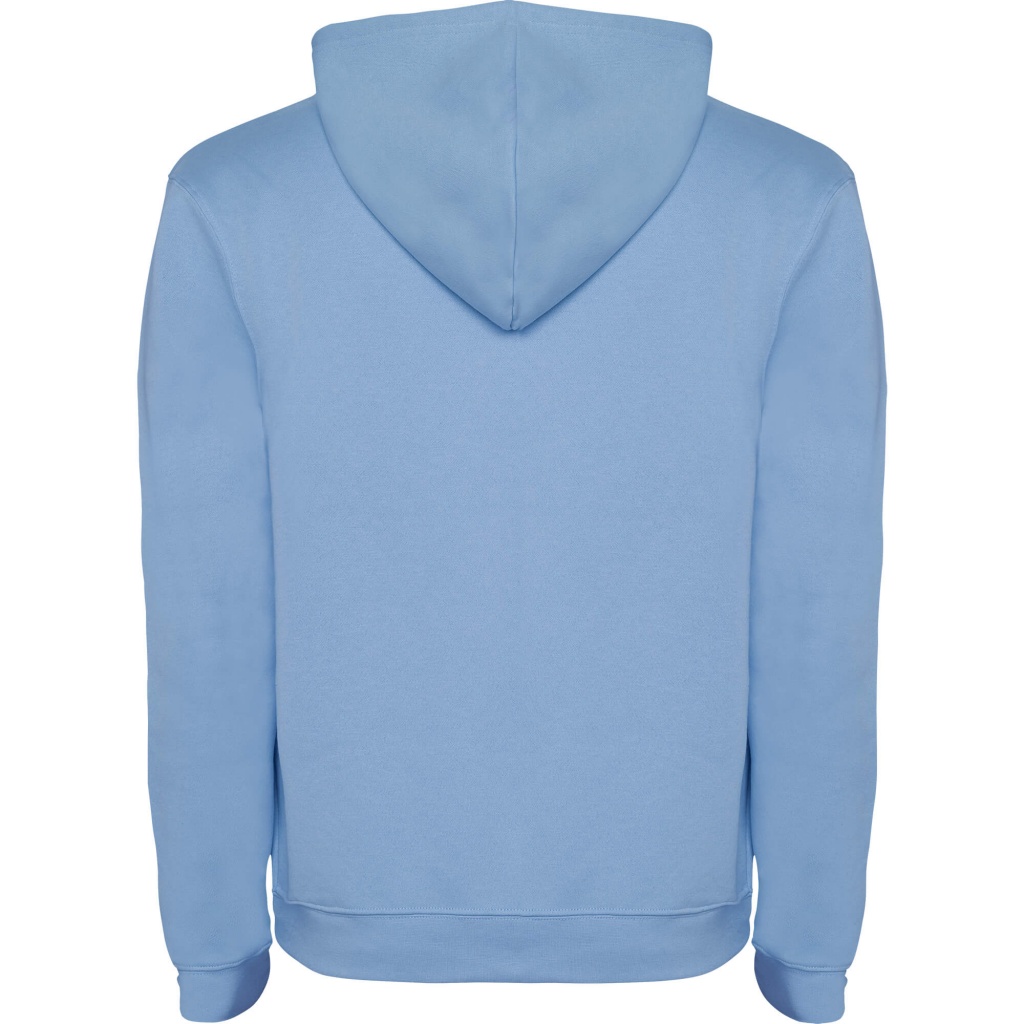 Two-tone double fabric hoodie with drawstring hem. Kangaroo style pocket. Elastic cuffs and waistband.