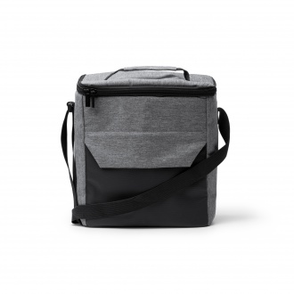 Thermal bag made of PU leather and 300D RPET fabric with isothermal interior. Large main compartment and exterior pocket with zipper closure. Handle with reinforcement and adjustable carrying strap.