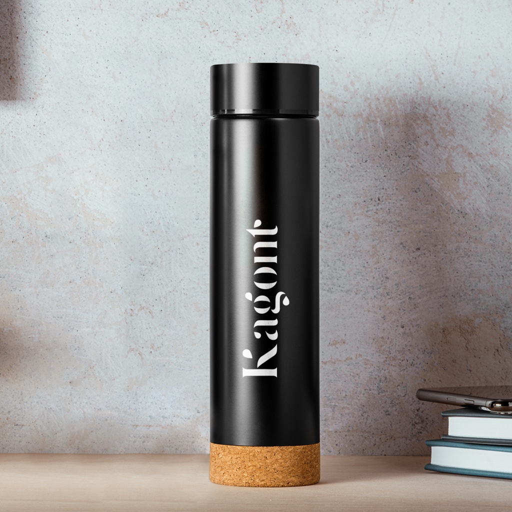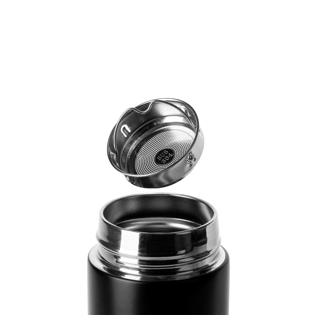 Double wall thermos bottle made of 304 steel with tea filter and cork base.