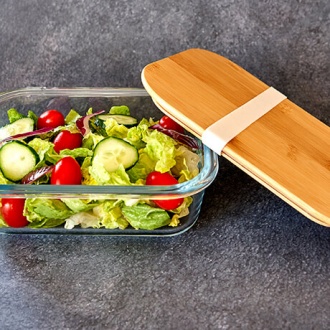 Glass eco lunch box with bamboo lid and silicone tightening strap.