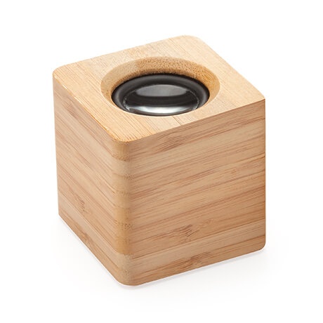 Wireless speaker with wooden casing and visible membrane.