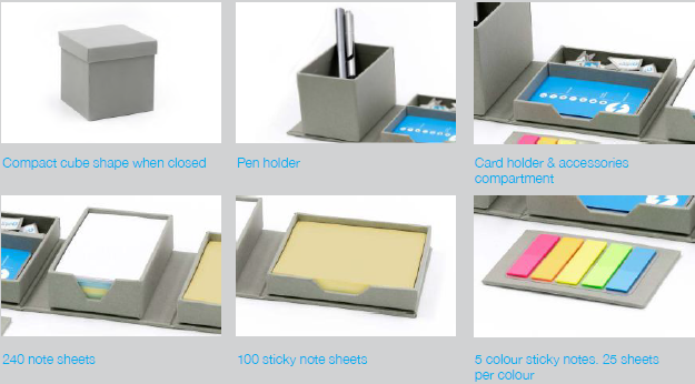 Evocube – a desk organizer and work accessories , the ultimate welcome gift for any company. This cube unfolds into a versatile desk organizer, designed to keep everything organized at your fingertips and your desk clean. Evocube includes all the essentials you need to function optimally in any workspace from day one: colorful sticky notes, notepads, post-it notes, a pen holder, a card holder, and more.