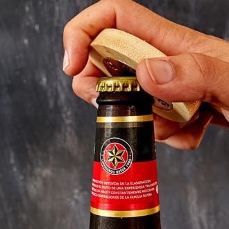 Magnetic bamboo bottle opener with coaster function.