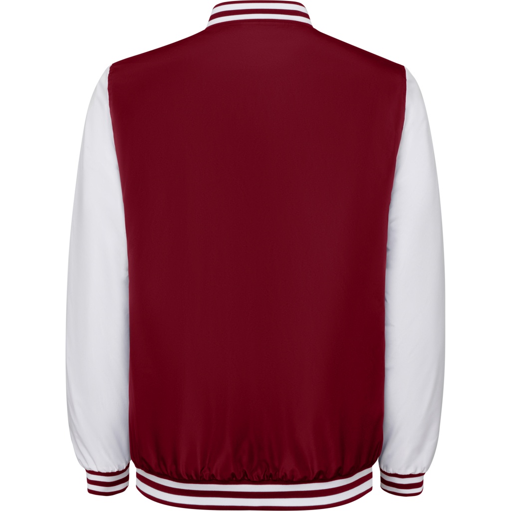 Unisex lightly insulated jacket in two colors. Collar, cuffs and hem with 1x1 ribbing, with two contrasting lines. Side pockets with zipper closure. Interior lined with lightly insulated lining. Plastic snap buttons in contrasting color. Access to interior on back and left side of chest for printing.