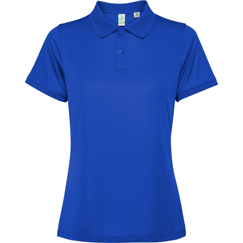 Women's short sleeve technical polo shirt. 1x1 ribbed polyester collar with plastic snap buttons in the color of the fabric. Seam masking trim in the same color. Sleeve finished with 1x1 ribbing in the same shade.